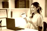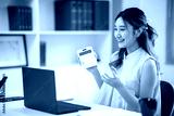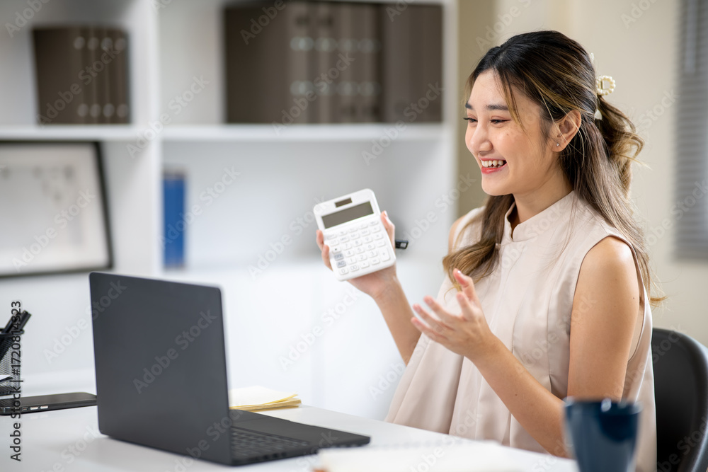 Woman office worker holding calculator raising hands talking in front of laptop on white table in office