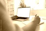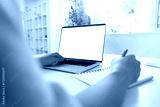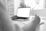 Work from Home: Focused individual writing notes while using laptop in a bright workspace