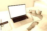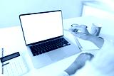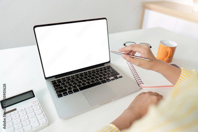 Work from Home. Professional woman using laptop for remote work with notebook and calculator.