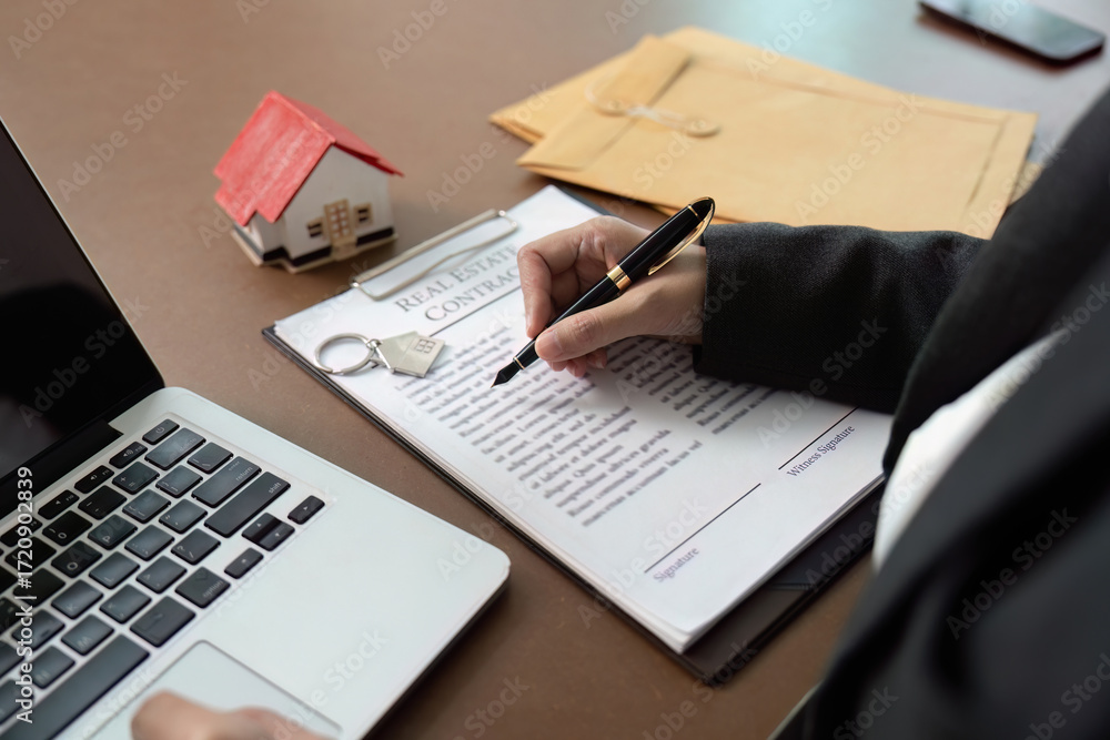 Lawyer signing real estate contract at desk