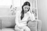 Dizzy asian young woman, girl headache or migraine pain suffering from vertigo while sitting on couch in living room at home, holding head with hand, health problem of brain or inner ear not balance.