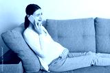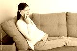 Emotional pregnant woman talking by mobile phone and cry at home in bed