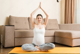 beautiful young pregnant woman sitting on mat in yoga pose at the home. Pregnancy Yoga and Fitness concept at coronavirus time
