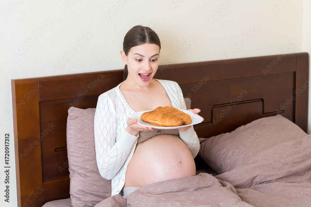 Young pregnant woman enjoys eating croissant in bed. Unhealthy pastry during pregnancy concept
