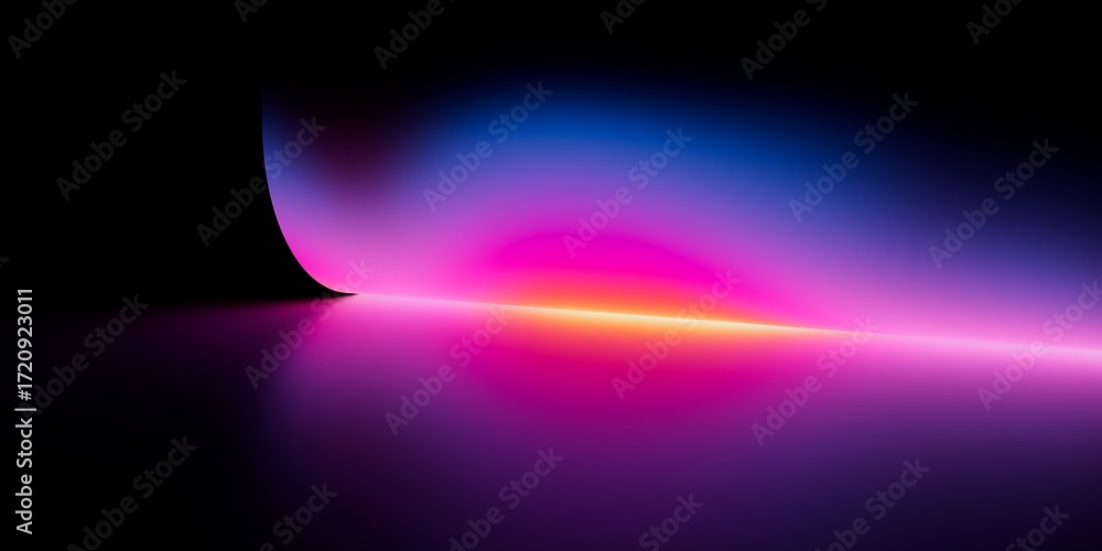 Soft neon gradient with blue and pink light streaks curving on black background, futuristic abstract stock image perfect for modern digital design.