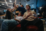 Friends engage in a fun and immersive gaming experience at a colorful and modern video game arcade. The atmosphere radiates joy and excitement.