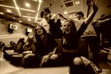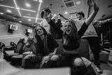 Group of enthusiastic friends playing video games in a vibrant gaming lounge, celebrating their victory with joy and excitement. A scene showcasing fun, technology, and strong social connections.