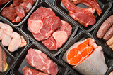 Black plastic packaging trays from supermarket with different types of fresh raw meat cuts, fresh beefbeef steaks, fish and variety meats in boxes from above
