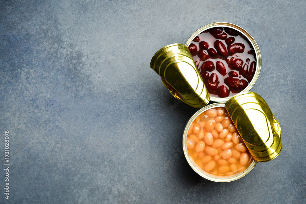 Canned beans in a metal can. Food for tourism or recreation. On a gray concrete background.