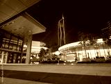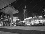 Urban plaza at night featuring modern illuminated architecture