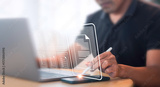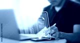 Person signing documents digitally while working on a laptop in a bright room during the day