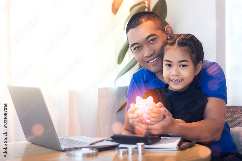 Father and daughter share a joyful moment while managing finances at home in the afternoon