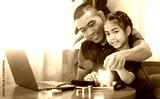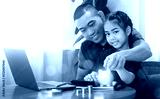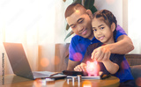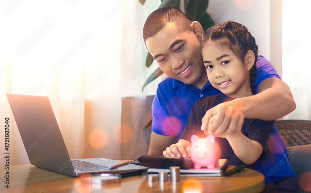 Father and daughter enjoy saving money together at home while using a laptop in the morning light