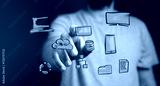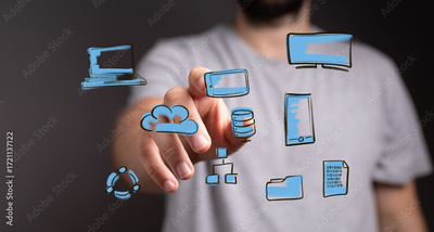 Hand interacting with digital icons, cloud computing, network, data, technology, innovation, connection, future, digital transformation, p