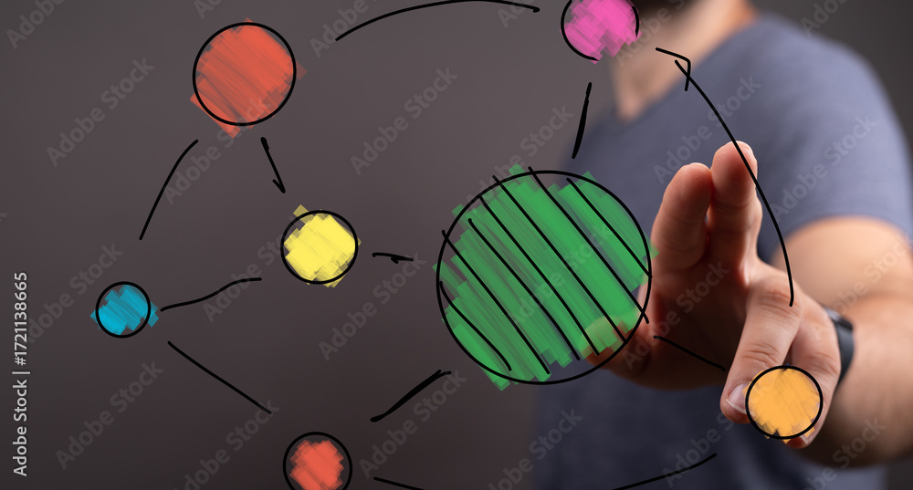 Abstract image of a man interacting with a colorful network diagram, perfect for technology, connection, and teamwork concepts.