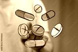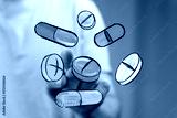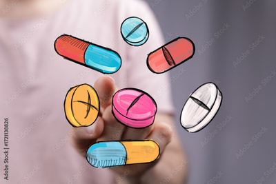 Digital illustration of various pills and capsules. Healthcare, medicine, pharmacy concept.