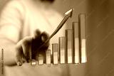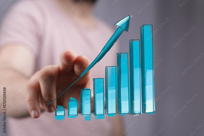 Stock photo of a hand interacting with a rising bar graph, symbolizing growth, success, and progress.