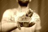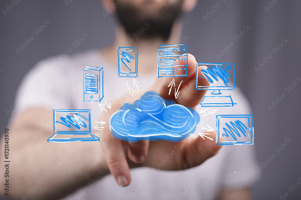 Stock photo of a man interacting with a digital cloud computing network. Perfect for tech, business, and innovation concepts.