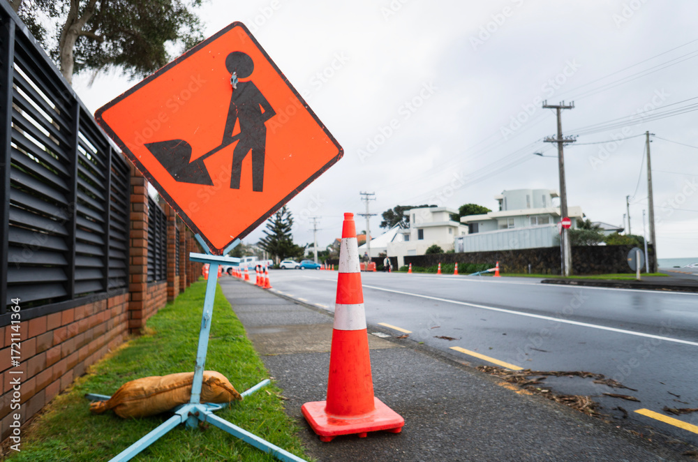 Roadwork Ahead sign by the road. Roadworks in Auckland.