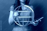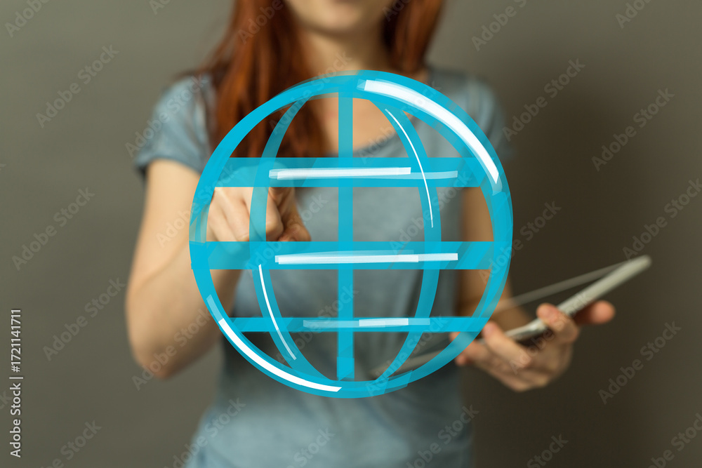 Close-up of woman interacting with a digital globe on her tablet, representing global connection and technology.
