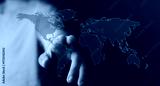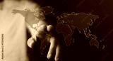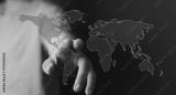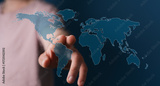 High-quality stock photo of a hand interacting with a digital world map, ideal for technology, global business, and connection concepts.