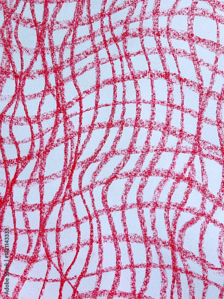 red crayons, draw a pattern resembling a tangled web or fibers on a white background. The pattern is curved