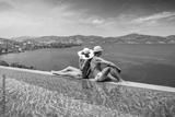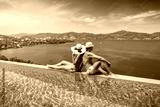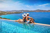 A couple relaxes at the edge of an infinity pool and enjoys the view of the blue, mediterranean sea during summer vacation time
