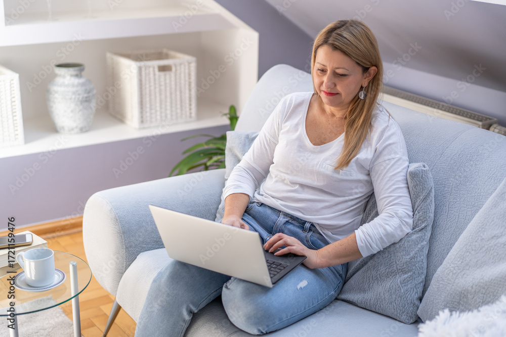 Beautiful mature woman using laptop sitting on couch at home