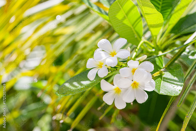 Stunning plumeria flowers in tropical garden, romantic exotic plants, vibrant floral beauty, peaceful relaxing nature, lush green foliage, summer bloom, tropical flowers closeup, serene outdoor scene