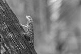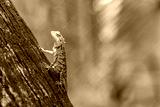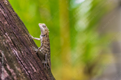 Lizard on tree branch in tropical garden, blurred foliage background, exotic reptile closeup, tropical wildlife, summer nature, peaceful natural environment, green leaves