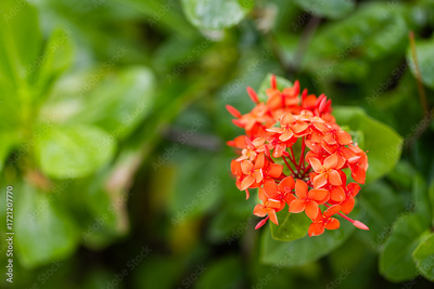 Beautiful red Pentas flowers closeup on blurred green tropical lush foliage background, relaxing peaceful nature scene, vibrant summer garden, tropical plants, floral detail bright natural environment