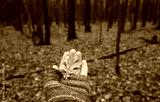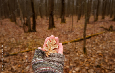 autumn background. hand with fallen oak leaf in raindrops close up outdoor, forest abstract nature backdrop. symbol of autumn season. walk in fall time. selective focus