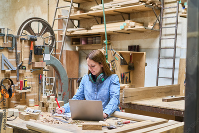Young woman working with laptop in a busy woodworking shop