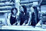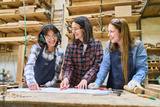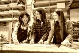 Young women engaging in teamwork at a busy lumberyard