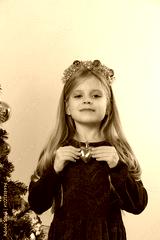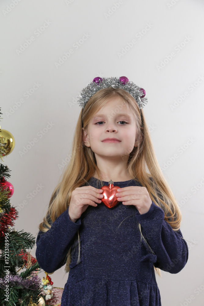 Portrait of cute little blonde girl holding Christmas ornaments next to the Christmas tree