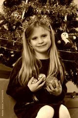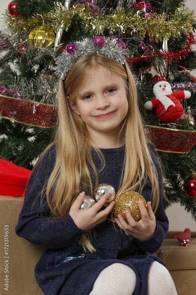 Portrait of cute little blonde girl holding Christmas ornaments next to the Christmas tree