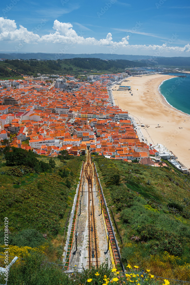 Panoramic View of Nazare Coastal Town with Red Rooftops and Atlantic Ocean in Portugal