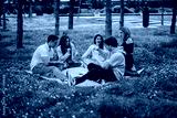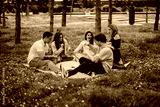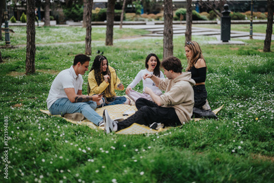 Friends having fun outdoors, gathered on a picnic blanket, engaging in cheerful activities among lush greenery, trees, and blooming flowers, capturing moments of leisure, togetherness, and nature.