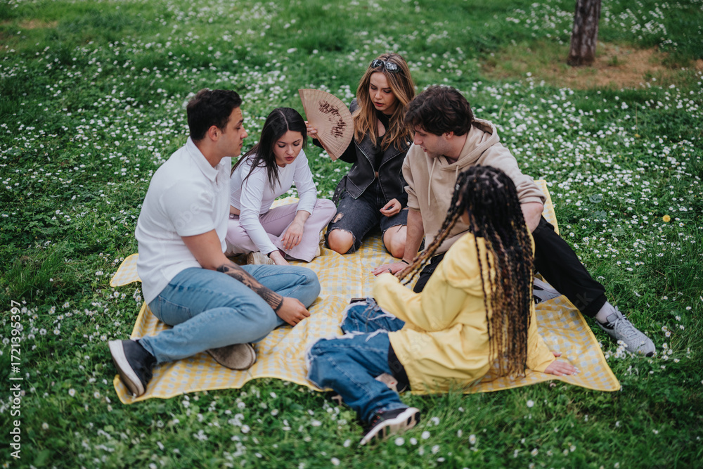 Friends gathering on a yellow picnic blanket in a green park, enjoying companionship and outdoor leisure on a pleasant sunny day.