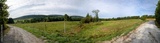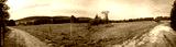 A panoramic view of a crop field with wind turbines in the background
