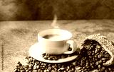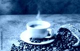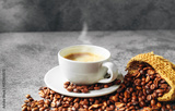 Coffee cup and coffee beans in sack on gray background, Espresso crema coffee cup aromatic