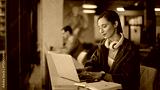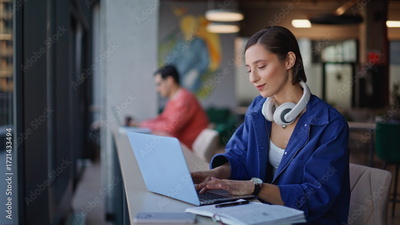 Inspired writer typing computer thinking on creative ideas at cafeteria closeup.