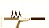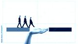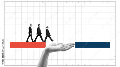 Collage of business team walking on abstract bars supported by open hand symbolizing guidance. Concept of leadership mentorship, workplace culture, career development, and corporate responsibility.