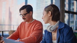 Closeup two startupers talking at marketing agency workplace. Smiling colleagues