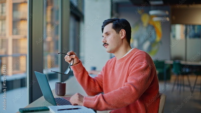Serious entrepreneur looking solutions sitting office coworking laptop closeup.