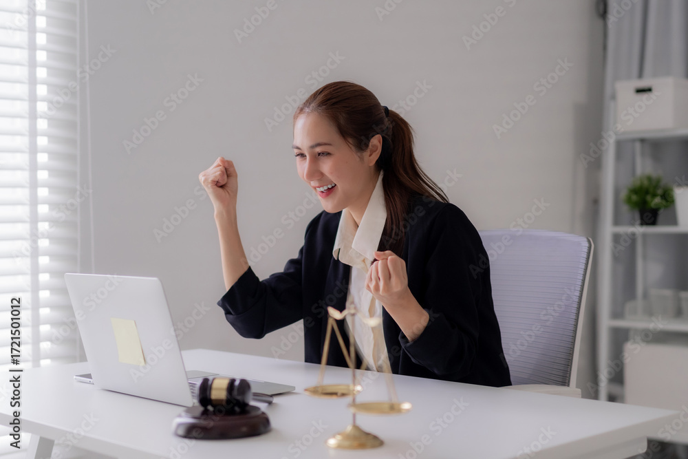 Asian Lawyer Celebrating Success at Law Firm Using Laptop After Winning Case Justice Achievement Euphoric Expression Achieving Goals Happy Emotional Victory Online