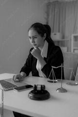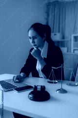 Asian Female Lawyer Thinking Hard at Desk with Laptop Scales of Justice Gavel Legal Document Preparation Due Diligence Legal Advice Contract Review at Office