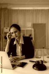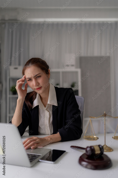 Asian Lawyer Feeling Stressed Working on Laptop in Office with Gavel and Scale Legal Overworked Female Attorney Law Firm Deadline Business Report Problems