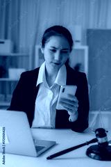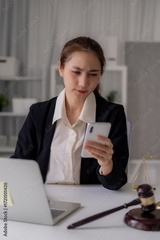 Asian Female Lawyer Reviews Legal Case on Mobile Phone at Office Desk with Laptop Gavel Scales of Justice Attorney Analyzing Contracts Documents