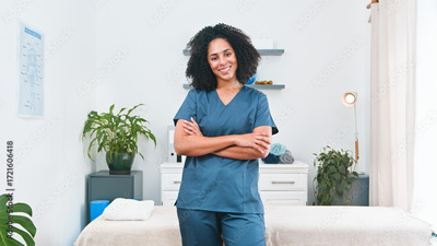 Confident Physiotherapist Stands In Modern Clinic With Plants, Smiling, Ready To Help Patients